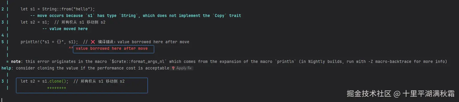 在上面代码中,创建 s1,它拥有 String 数据的所有权,然后s1 的所有权移动给了 s2,最后又尝试使用已经失去所有权的 s1