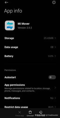 步骤 2. 如果问题仍然存在,请从两台设备上卸载 Mi Mover,重启设备,然后从官方商店重新安装该应用。