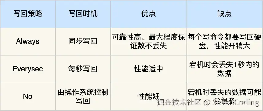 显然Always写回策略是由主进程执行的,总是调用fsync函数;Everysec异步执行,不影响主线程;No则redis不控制写回,最终交给操作系统决定何时写回;不影响主线程
