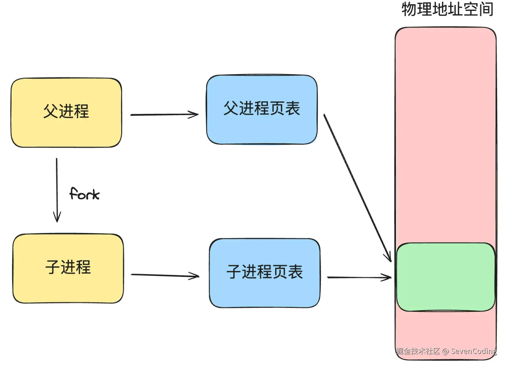 - fork系统调用会产生一个子进程,与父进程共享相同的内存地址空间,这样进程在这一时刻就能拥有与父进程的相同的内存数据。