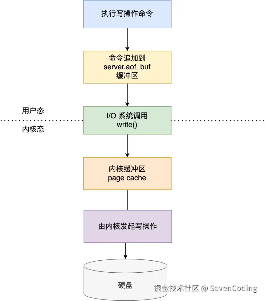 - 然后通过 write() 系统调用,将 aof_buf 缓冲区的数据写入到 AOF 文件,此时数据并没有写入到硬盘,而是拷贝到了内核缓冲区 page cache,等待内核将数据写入硬盘;