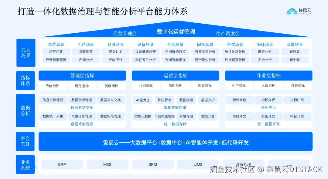 - 业务层: 围绕两大核心业务域落地:一是生产运行和能源协同域,解决核心生产力问题,实现连续工艺协同、能耗平衡优化、设备健康监测等,提升生产稳定性和能耗效率;二是经营利润管理协同域,面向管理层,实现单产品成本分析、资产运营效率评估等,让企业看清生产、经营与利润结构。