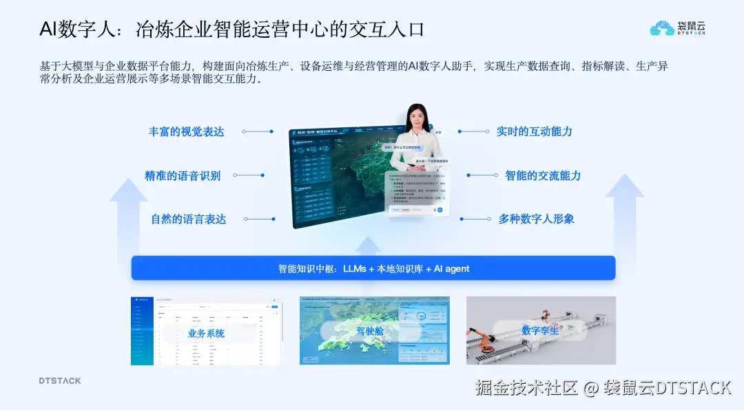 为解决企业生产管理依赖人工经验、知识难沉淀、异常处理效率低等问题,构建懂工艺、懂业务、懂数据、懂管理的业务智能体,成为企业的“数字员工”。这类智能体可实现工艺异常辅助分析、业务流程协同、全局数据快速查询、经营报告自动生成等功能,同时引入AI数字人作为智能运营中心的统一入口,通过自然语言交互、智能分析、可视化联动能力,实现“人找系统”到“系统主动服务人”的转变,让管理层通过简单问答即可获取分析结果、查看全局数据。