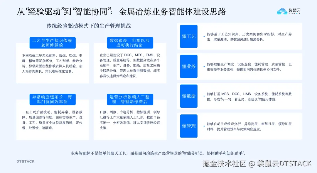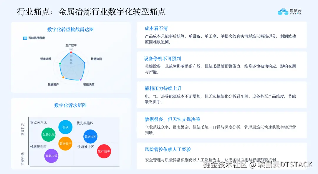 在数字化转型过程中,冶炼企业虽完成了一定的系统建设,但仍面临诸多现实痛点,核心问题在于数据增长与管理能力升级不同步,无法将数据转化为实际的运营能力。