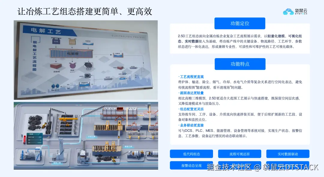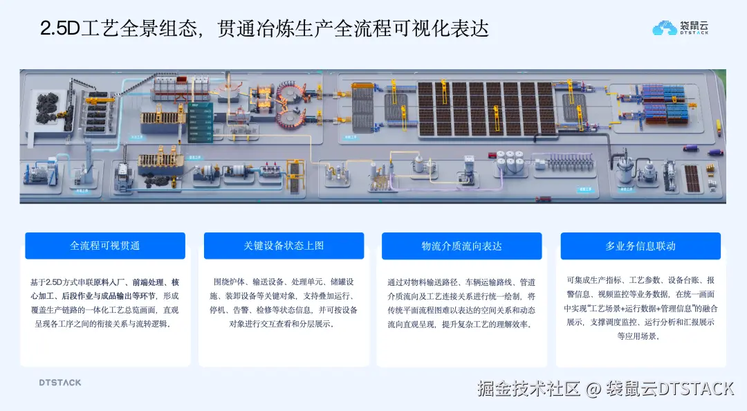 针对传统二维流程图静态化、三维建模成本高的问题,引入2.5D工艺组态方式,在二维和三维之间实现平衡。该方式让工艺流程更直观,一体化表达炉体、烟气、水电气等复杂关系;系统搭建更轻量,通过拖拉拽快速组合工艺流程,降低建设成本;数据与业务深度联动,将实时设备状态、工艺参数、报警信息映射到工艺流程上,让工艺图成为实时运行界面,实现从“看图理解”到“实时可视+数据驱动”的升级。