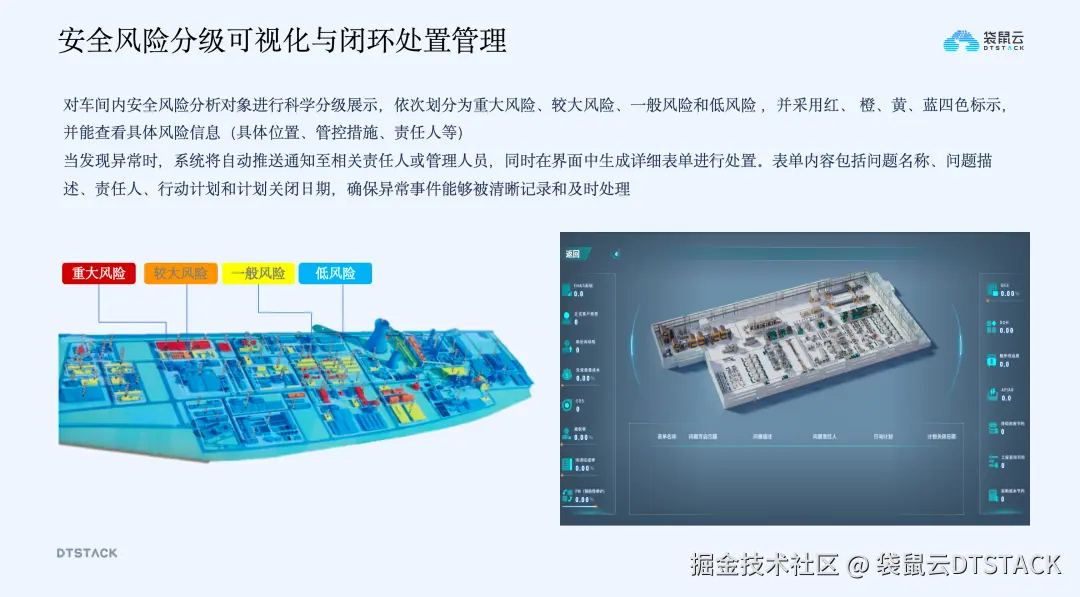 针对冶炼行业高温高压、有毒气体等风险点多的特点,通过数字孪生系统实现安全风险的全流程管控:一是让风险看得见,在厂区三维场景中用不同颜色标识风险等级,直观展示风险分布;二是让风险分得清、查得到,点击风险点即可查看风险位置、类型、管控措施、责任人等详情;三是实现风险闭环处理,风险识别后自动触发预警并推送责任人,生成整改任务并记录全流程,直至问题关闭,让安全风险从“看不见、管不住”变为“可视化、可管控”。