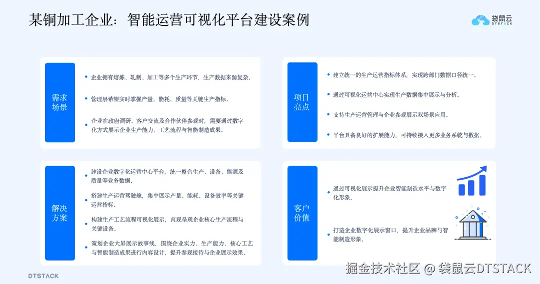 该企业生产环节多、数据来源复杂,且缺乏统一的经营指标视图和对外展示平台。为此,为其打造数字化运营中心,整合生产、设备、能源、质量数据,构建统一指标平台,实现数据口径标准化;通过运营驾驶舱实时分析能耗、产量、设备效率等指标,结合可视化手段直观展示工艺流程和核心产线;专门设计大屏展示内容,适配参观接待、政府调研等场景。项目亮点在于实现了跨部门数据统一和指标标准化,同时兼顾运营管理和企业展示两大场景,不仅提升了企业内部经营管理水平,还打造了数字化展示名片,显著提升了智能制造形象。