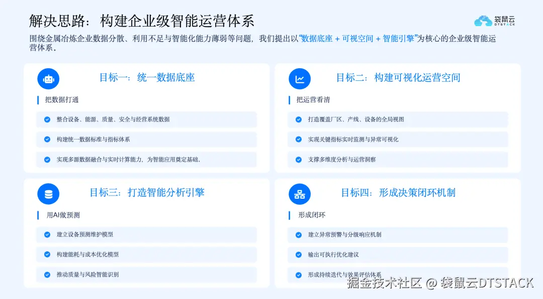 针对行业痛点与发展趋势,构建企业级智能运营体系成为冶炼企业数字化升级的核心思路,该体系以“数据底座、可视空间、智能引擎”为核心,通过四层建设目标,实现数据整合、运营可视、智能分析与决策优化的全流程闭环,让数据真正服务于生产运营。