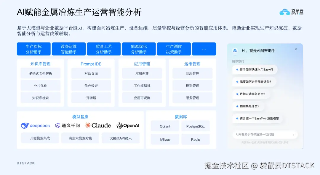 将AI能力拆解到各业务岗位,为生产、设备运维、质量工艺、能耗管理、生产调度等岗位配备专属AI助手,让智能分析能力覆盖生产运营全流程,每个岗位都能借助AI技术提升工作效率和决策准确性。