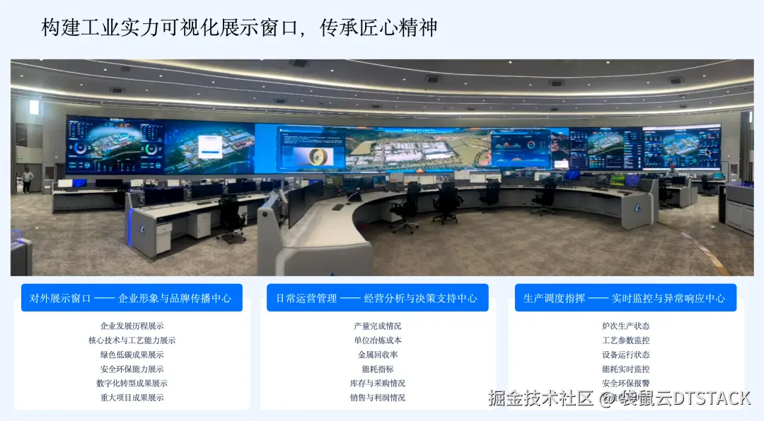 数字化运营中心是企业数字化能力的集中体现,承担着对外展示窗口、日常经营管理中心、生产调度与指挥中心三大核心职能。作为展示窗口,通过数字孪生展示企业发展历程、绿色低碳成果等,打造数字化名片;作为管理中心,实时呈现产量、单位成本、能耗等指标,支持多维度分析,助力管理层快速决策;作为调度中心,实时监控炉况、工艺参数、设备状态,实现异常实时预警,支撑生产现场高效调度。