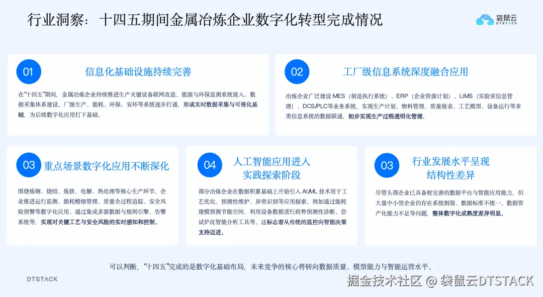 - 行业数字化发展水平差异显著: 大型钢铁、有色金属集团等头部企业已具备完善的数据平台和智能应用能力,但大量中小企业仍面临系统割裂、数据标准不统一、数据资产沉淀不足等问题,行业数字化成熟度参差不齐。