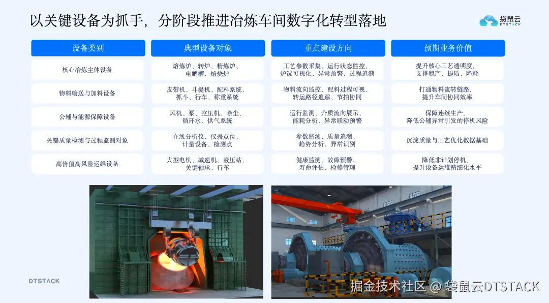 冶炼企业是设备驱动型生产体系,设备状态直接影响产量、质量、能耗和安全,因此以关键设备为抓手分阶段推进数字化转型是务实选择。重点围绕五类设备展开:核心冶炼主体设备(熔炉、电解槽等)、物料输送加料设备(皮带机、配料系统等)、能源保障公共辅助设备(风机、空压机等)、质量检测设备(在线分析仪、传感器等)、高价值高风险运维设备(大型电机、液压系统等),抓住关键设备就抓住了生产运营的核心。
