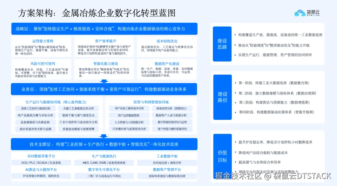 冶炼行业数字化升级的核心是打造数据驱动的运营能力,整体蓝图从战略层、业务层、技术层三个维度出发,围绕“连续稳定生产、极致能效优化、安全环保合规”三大核心目标展开,实现企业全维度的数字化升级。