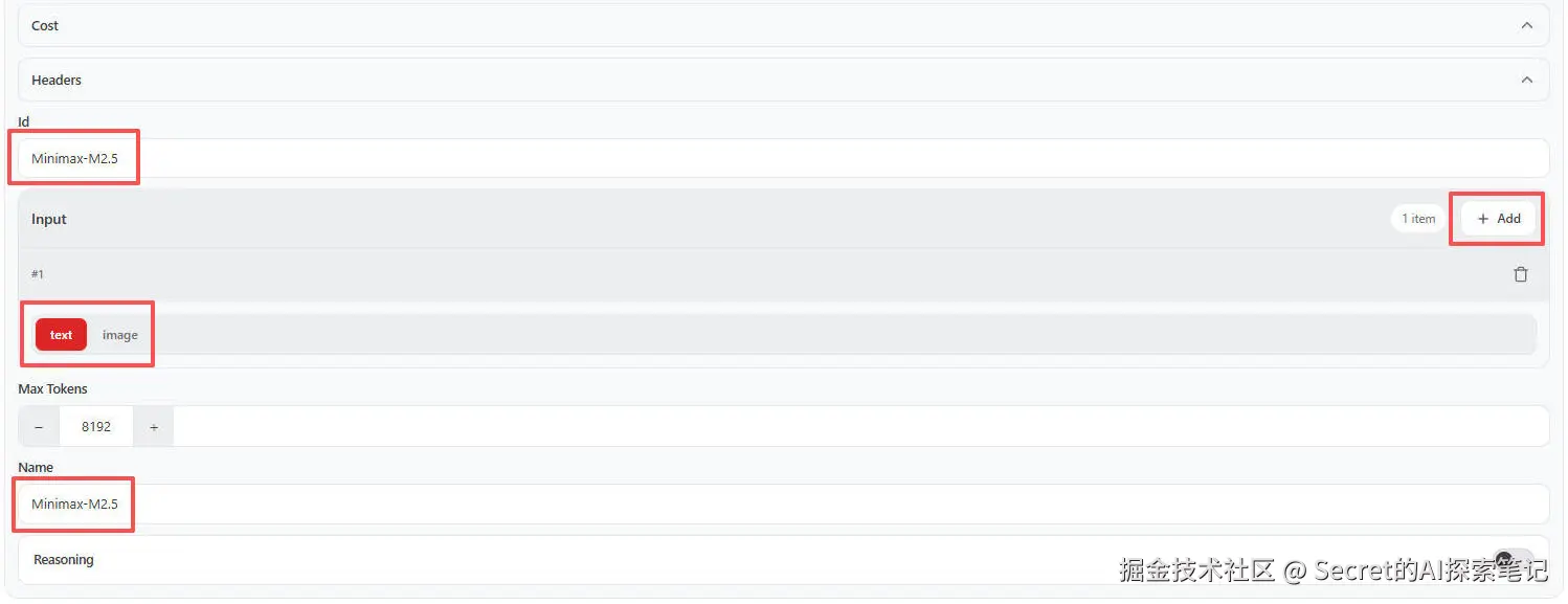 配置 Input(输入)类型,点击 + Add(添加)按钮添加(多模态模型需添加2个类型):