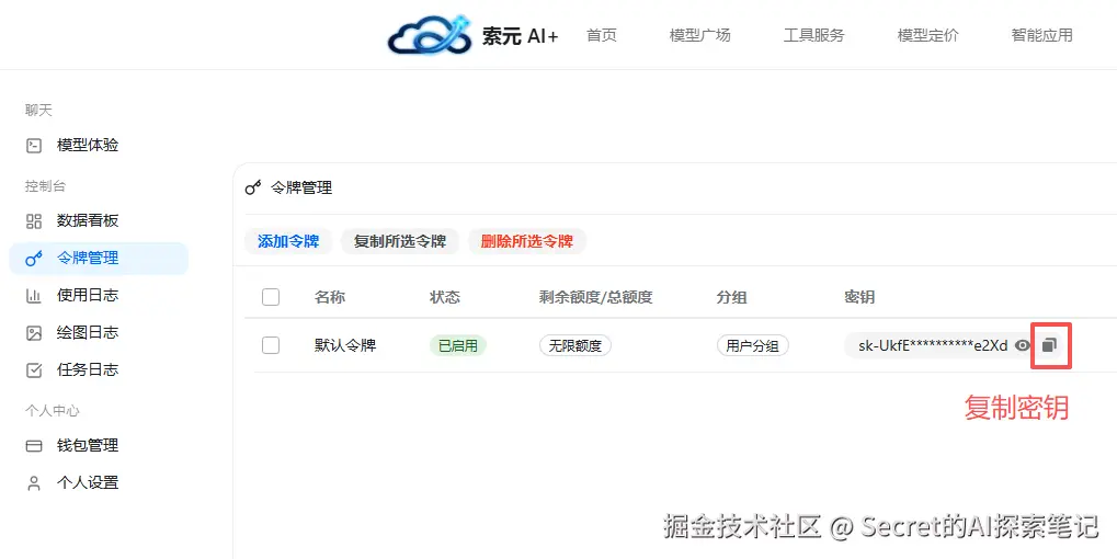 进入www.soyenai.com,登录后点击菜单位置的【令牌管理】,会出现系统自动创建的默认令牌(如果没有出现默认密钥,请点击【添加令牌】-【名称】随意-【令牌分组】选择【Default】,点击提交即可),点击复制按钮即可得到密钥。