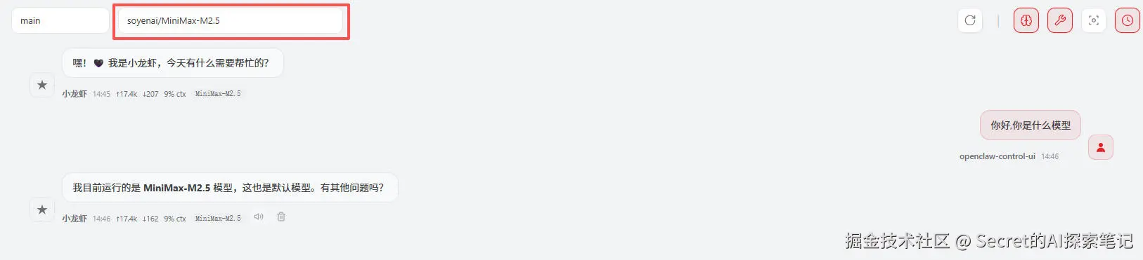 2. 进入 Chat(聊天)界面,在顶部模型选择框中选择配置的索元 AI+ 模型(如:soyenai/Mini-Max2.5),测试模型