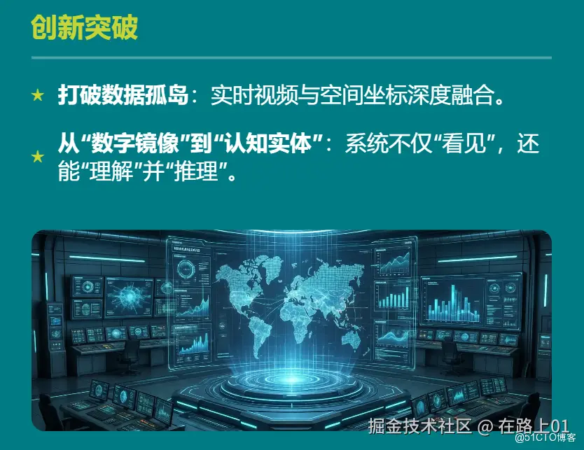 - 空间化的认知: 借助空间语义大模型,系统不仅能看到画面,还能理解画面。它可以自动识别画面中的“人、物、行为”,并将这些信息与三维空间坐标深度融合。例如,当摄像头捕捉到一名工人进入高压区域时,系统能够立即在实景地图上标记该位置,并关联相关的安全规则。