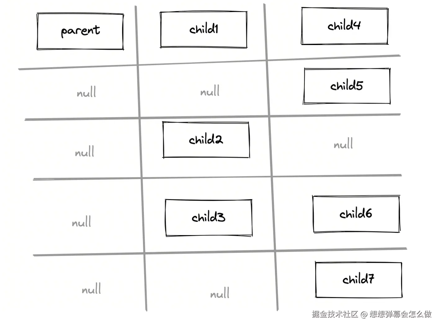 使用递归函数,计算每个节点在表格中的位置(x, y),然后再把这个树打平,构建一个treeMap。再根据map构建一个tableArray数组,填入表格中,就实现了树的自动布局;