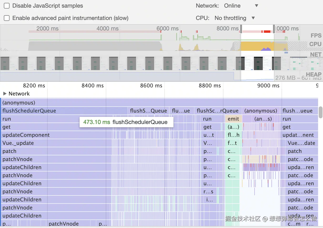项目上线后,很快就遇到了超大树的性能问题,主要集中在切换,删除,新增的节点会出现性能卡顿。chrome的火焰图可以看出,在进行这些操作时vue会进行大量的patch操作。