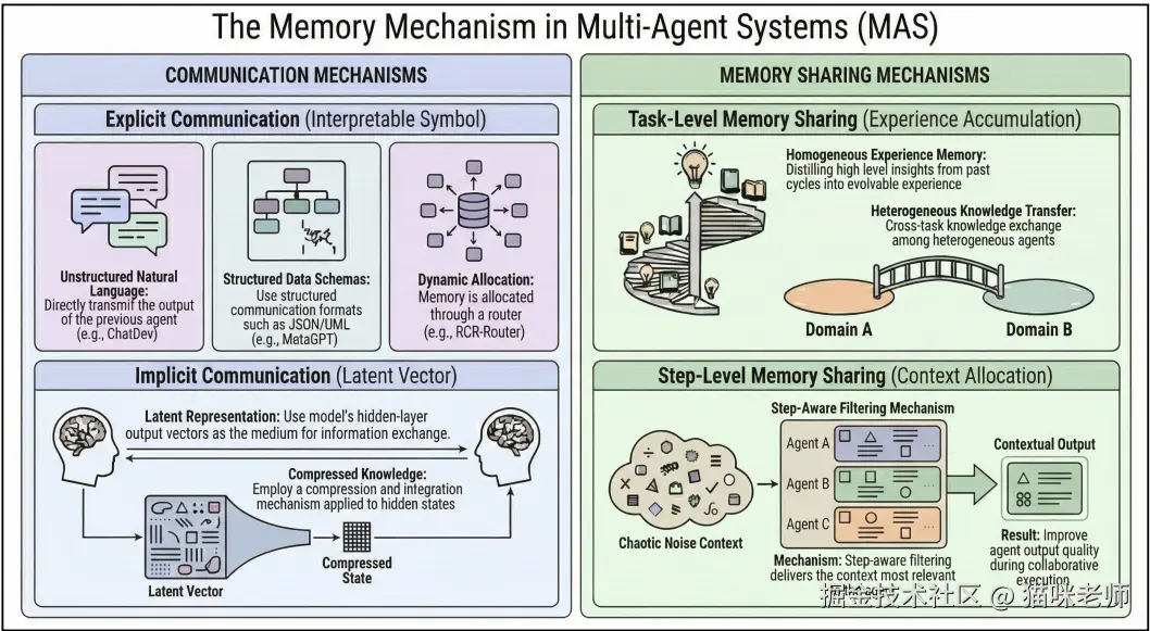 因此,多智能体系统记忆机制的相关讨论归纳为两大核心部分,即通信机制与共享机制: