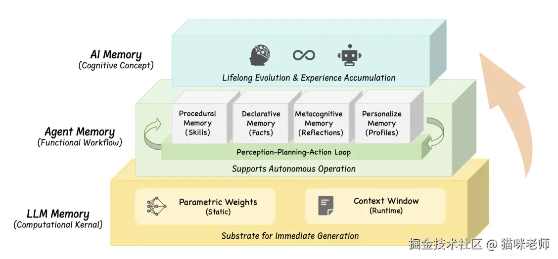 AI 记忆:是信息持久化与进化的最广义定义。它既包含人工认知的生物启发思路,也指向终身学习的最终目标。LLM 记忆提供预测引擎,智能体记忆管理面向任务的执行,而 AI 记忆则定义了终身进化与经验积累的框架,确保在多样化环境与长期交互中实现连续、自适应、符合人类偏好的生命周期。
