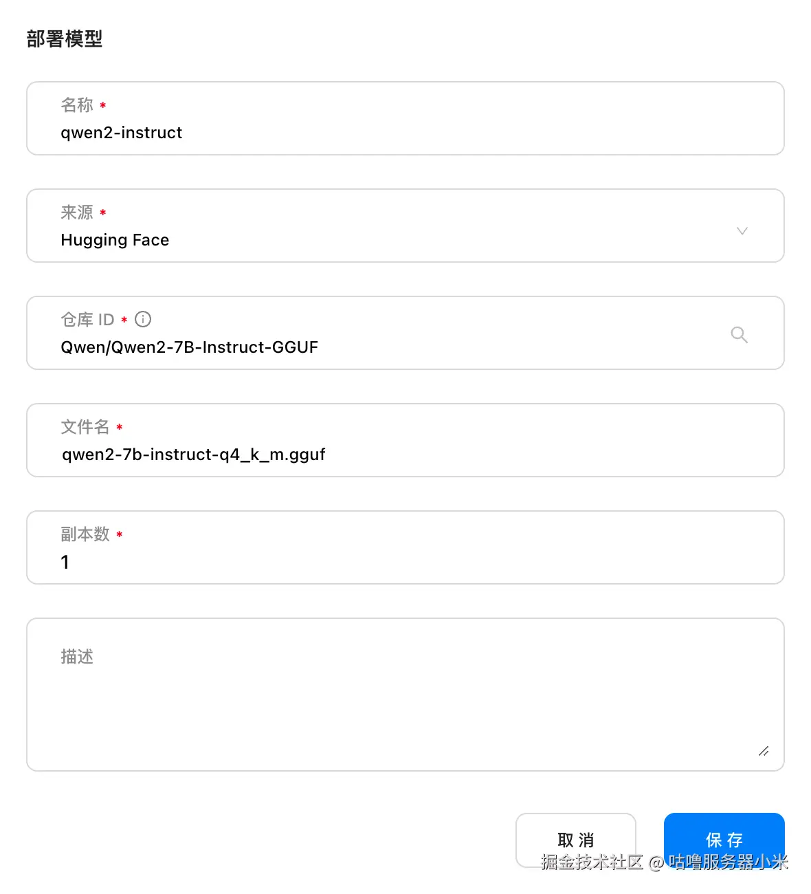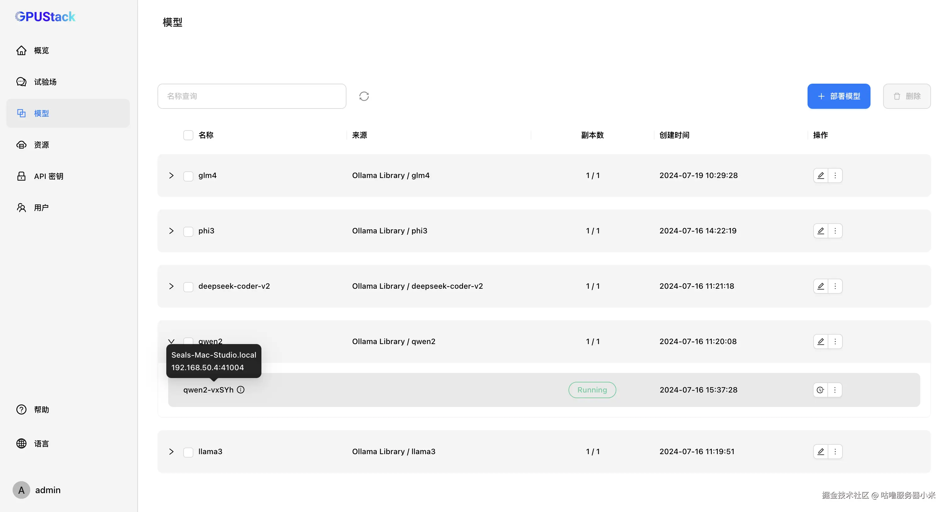 - 访问 GPUStack,在模型中部署你需要的大模型,选择从 Hugging Face (注意当前仅支持 GGUF 格式的模型文件)或 Ollama Library 下载模型文件到本地并运行大模型: