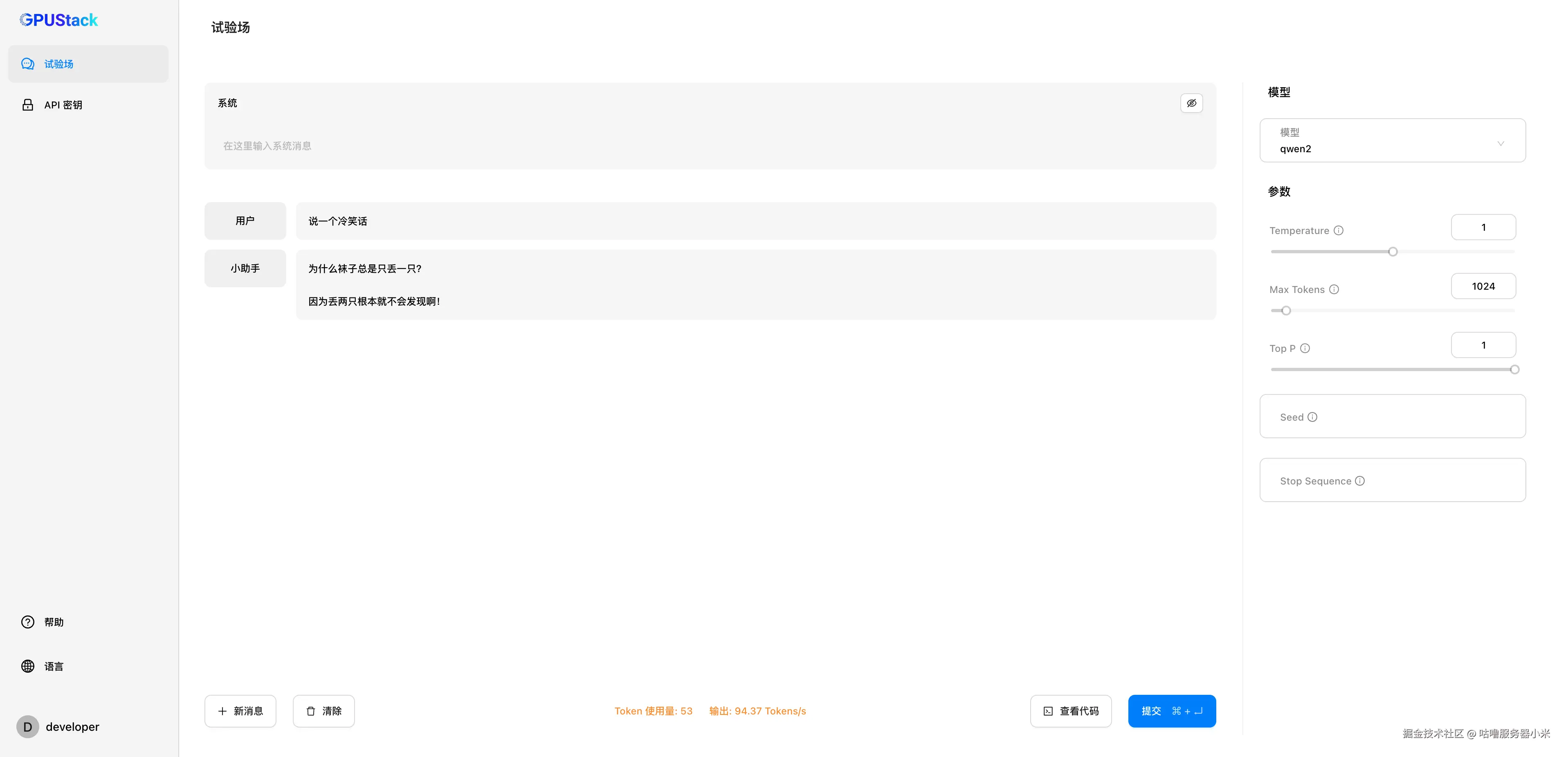 作为一个 AI 应用开发人员,你可以以普通用户的角色登录到 GPUStack 并导航到菜单中的试验场,你可以在这里通过 UI 跟大模型进行交互。