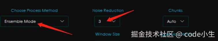 Process Method进阶模型选择最后一个最新的,Noise Reduction数值越大,对声音的处理越粗糙,数值越小,对声音的处理越精细,一般选择3即可,Chunks 选择 full