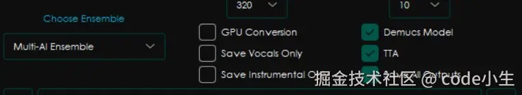 在Choose Ensembe里选择Multi-AI Ensemble是系统智能分离,效果会好一些;Vocal Models则是人声输出优先
