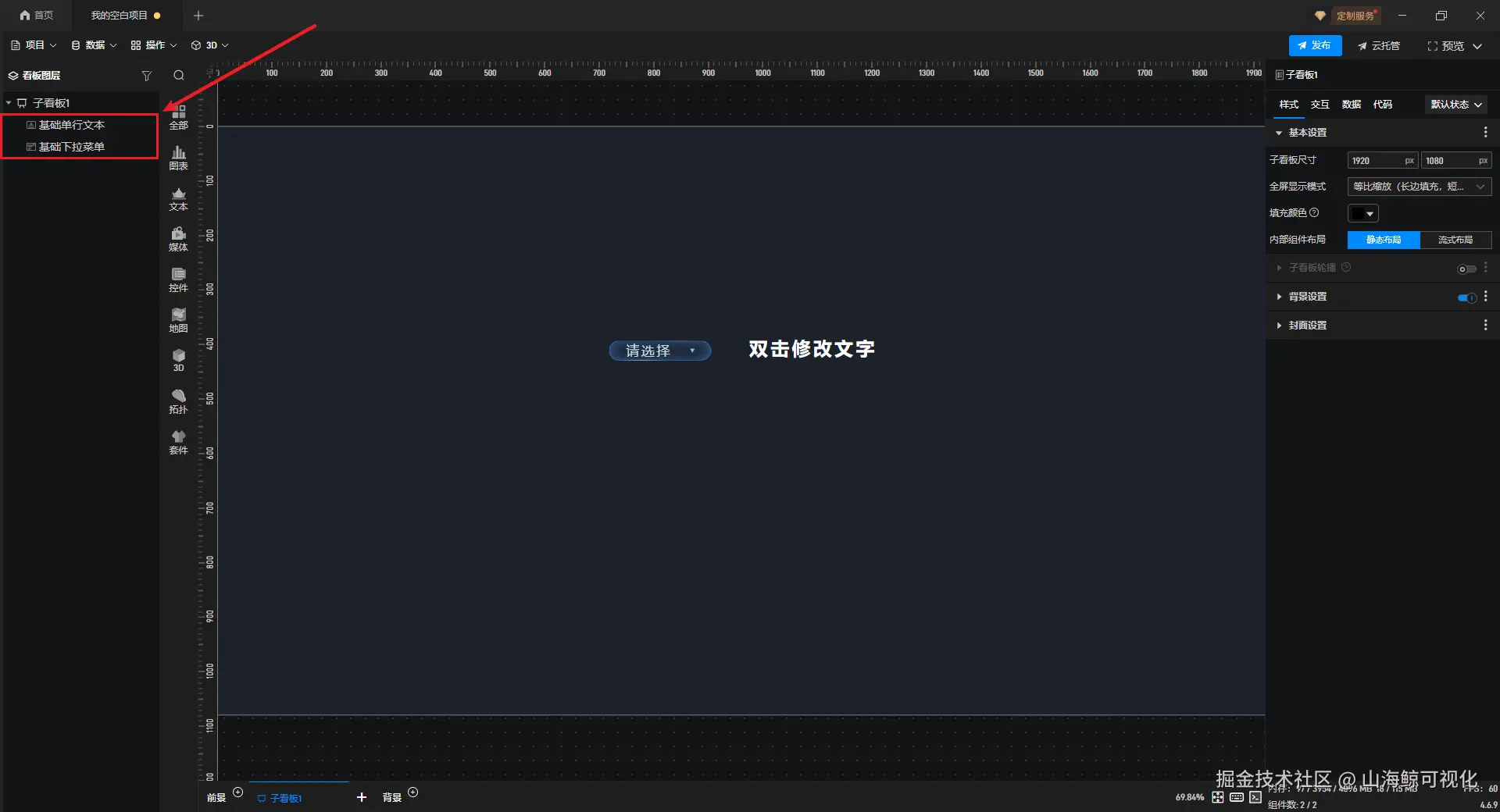 在制作可视化项目时,我们有时会需要通过下拉菜单联动改变单行文本组件内容,此时我们就可以通过设置数据联动,来让单行文本组件显示下拉菜单中选择的选项。