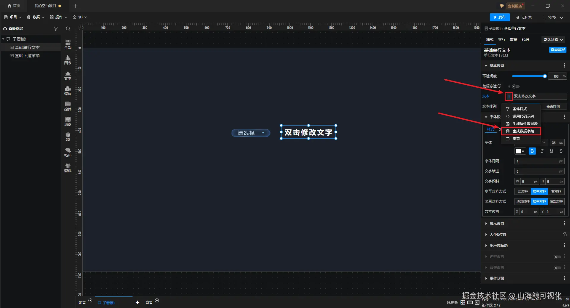 - 接着选中 “单行文本” 组件,在 “文本” 设置项处开启 “扩展设置” ,选择 “生成数据字段” 。