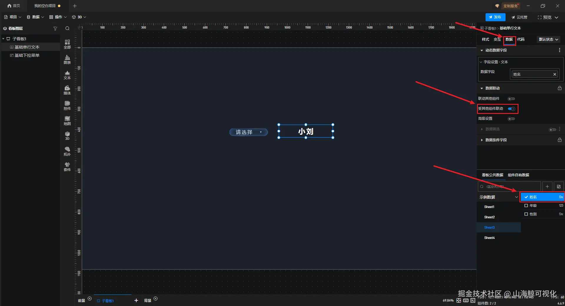 - 在 “数据” 中,将 “姓名” 字段添加进去,并开启 “受其他组件联动” 。