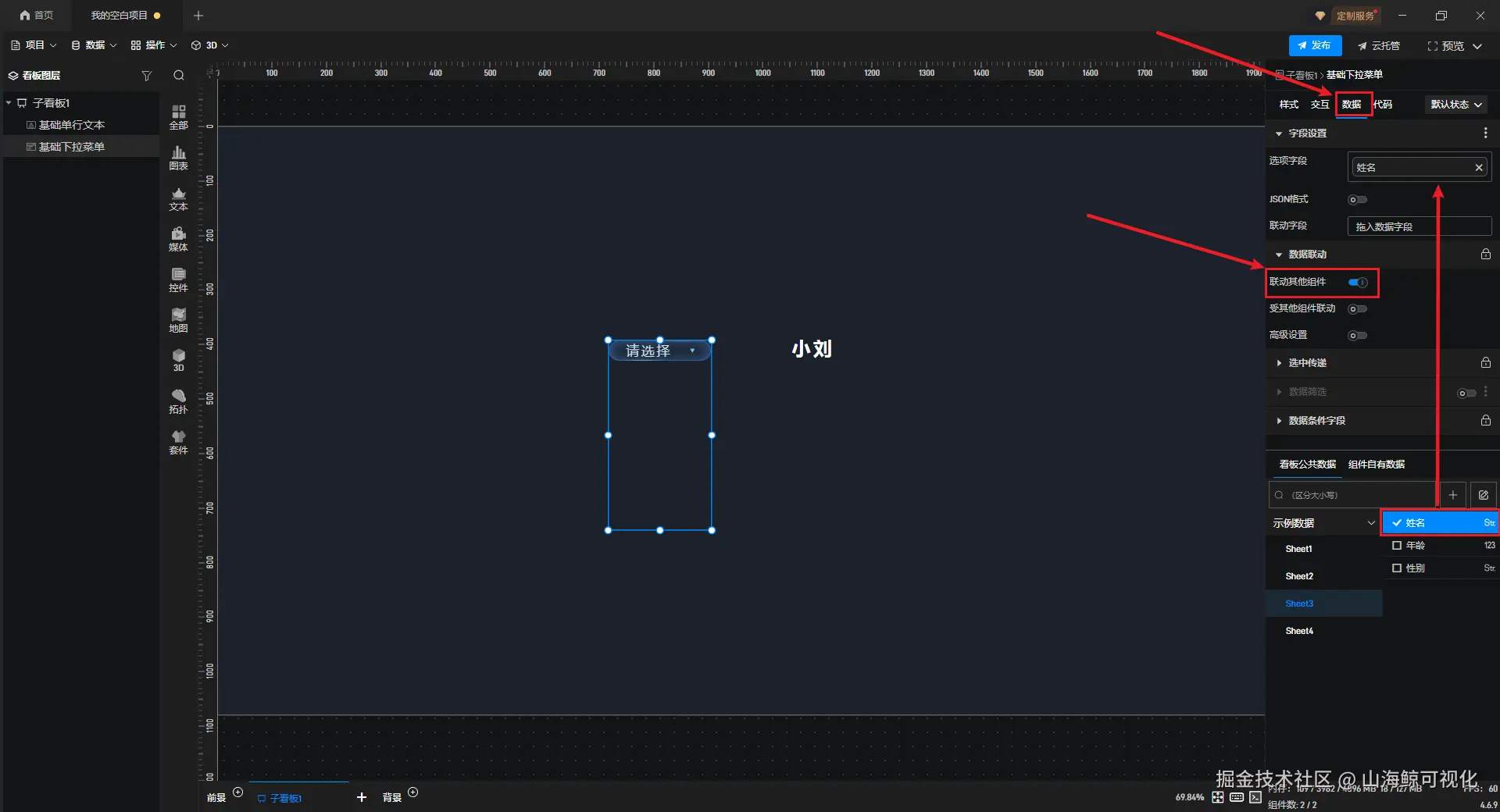 - 选中 “下拉菜单” 组件,添加数据字段,开启 “联动其他组件” ,这里以 “姓名” 字段为例进行演示。
