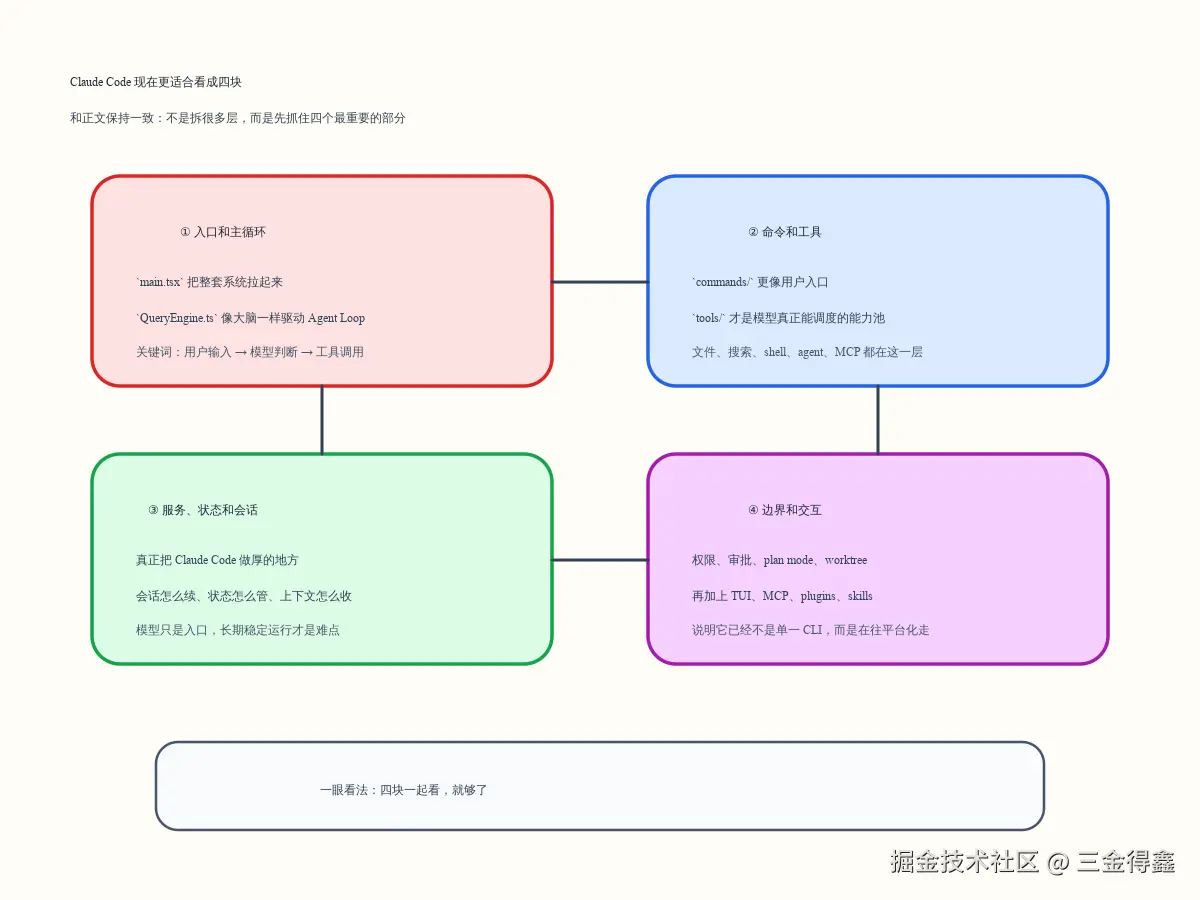 把它再串一串:用户输入 → Query Engine 组装上下文和工具 → 模型决定要不要调用工具 → 工具执行 → 结果回流到会话和 UI → 下一轮继续。