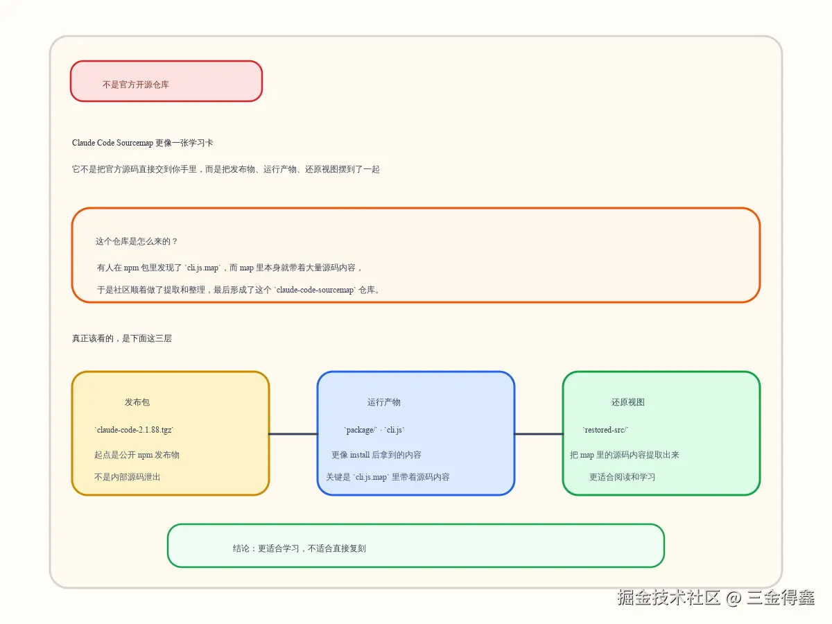 需要注意的是,这个不是官方源码仓库,准确的说它是一份基于公开发布包和 source map 还原出来的学习材料。