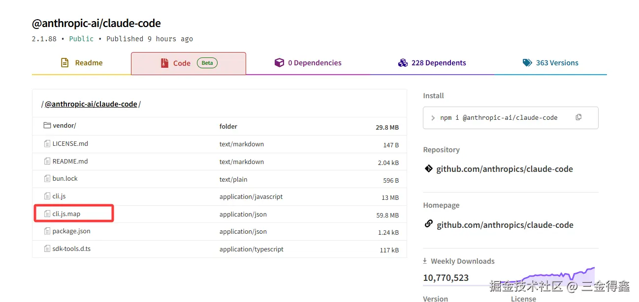 今天冒出来一个挺有意思的信息:在 Claude Code 最新版本 2.1.88 npm 包中,上传了一个 cli.js.map 文件。这类文件通常用在调试中,用于 Source Map 源码映射,也就是说可以通过它看到源码。