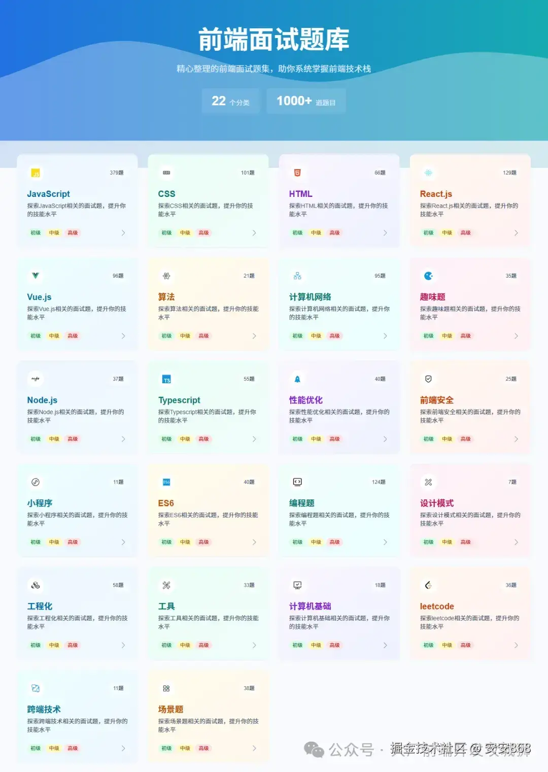 各类八股:JavaScript、HTML、css、react、vue、TS、工程化、设计模式、小程序、性能优化、场景题、项目细节、项目难点亮点、低代码、算法、node、ES6等等