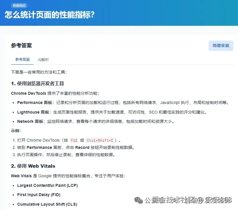 - 性能优化更贴近一线实战。不是背“减少HTTP请求”等原则,而是直接给你一个线上LCP数据(比如4.2秒),以及一份关键资源加载清单,让你现场分析瓶颈并给出可落地优化方案。
