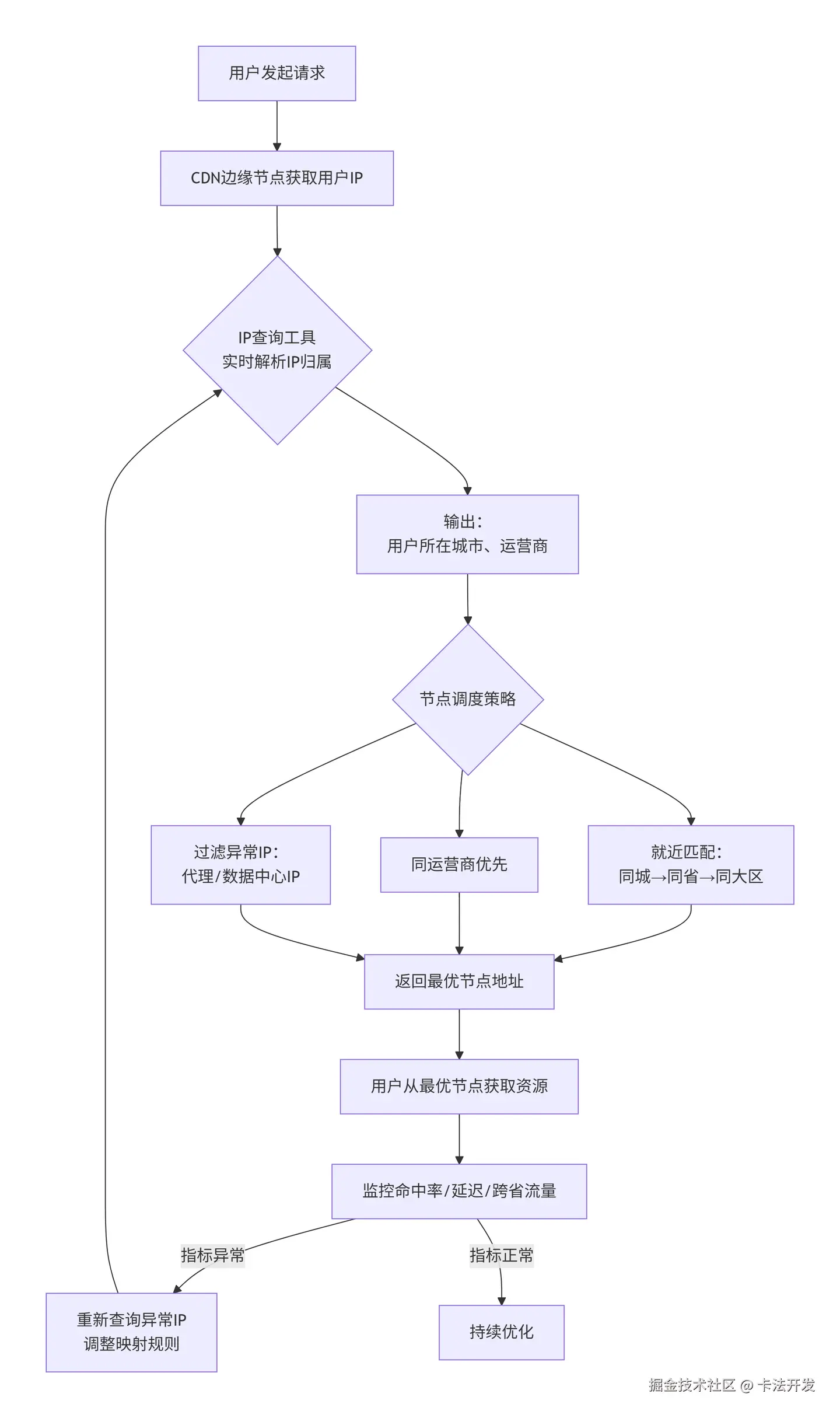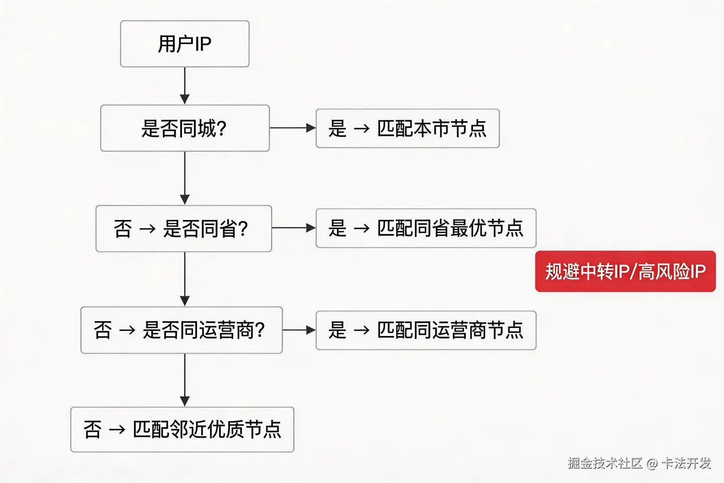 拿到IP数据后,需遵循**“同省优先、同运营商优先、规避异常IP”的映射规则: 同城用户优先匹配本市节点,无本市节点则匹配同省最优节点;同运营商用户优先匹配对应运营商节点;同时规避中转IP、高风险IP对应的节点,减少无效调度 。