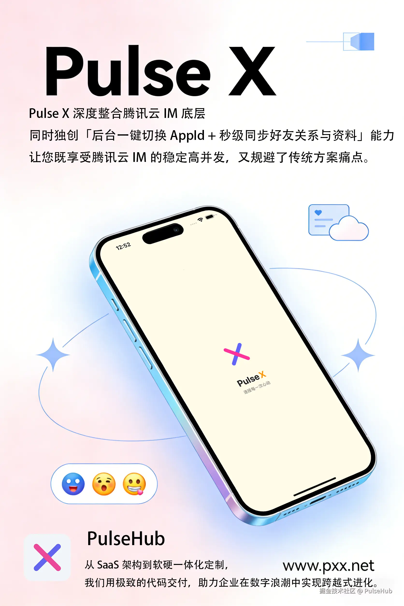 Pulse X 深度整合腾讯云IM底层,同时独创「后台一键切换AppId + 秒级同步好友关系与资料」能力,让您既享受腾讯云IM的稳定高并发,又规避了传统方案痛点。