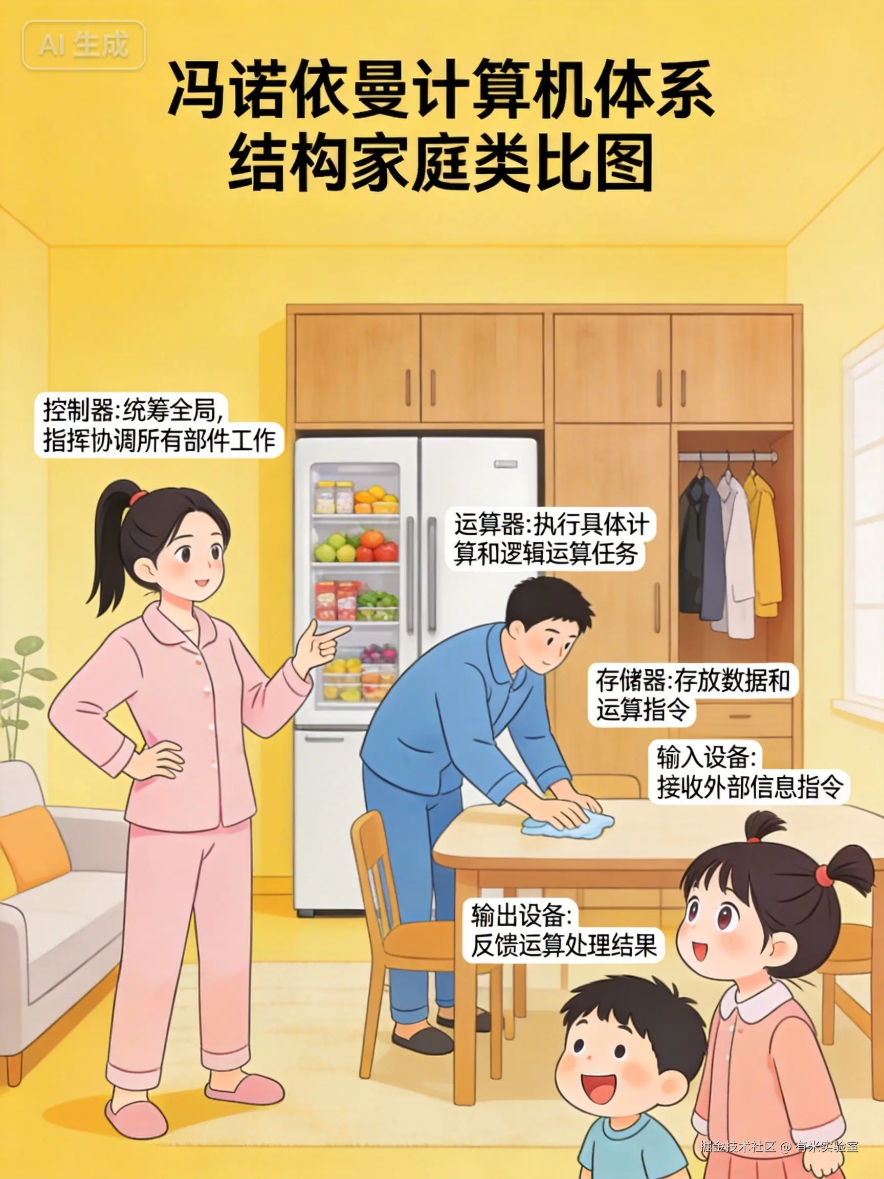 我忍住笑,继续给他解释:"你看,爸爸每天去上班赚钱(运算器),妈妈在家统筹安排(控制器),我们家的冰箱和衣柜存着衣服和食物(存储器),你的嘴耳朵接收指令(输入设备),你的哭笑声就是输出设备(输出设备)——这就是一个完整的冯诺依曼体系!"