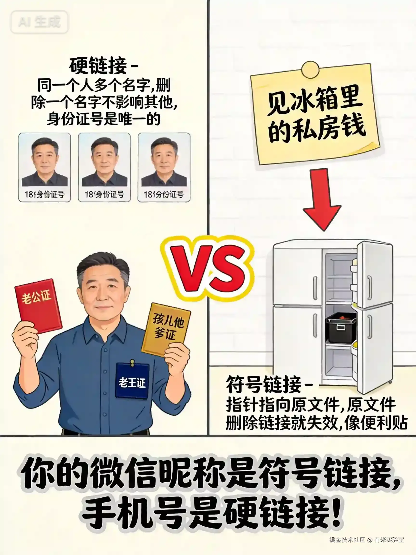 真相:硬链接是"同一个人,多个名字"(身份证号一样,名字可以多个);符号链接是"指向另一个人的指针"(类似微信昵称,改了还是同一个人)。