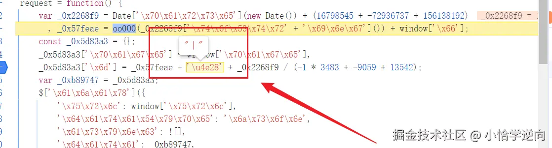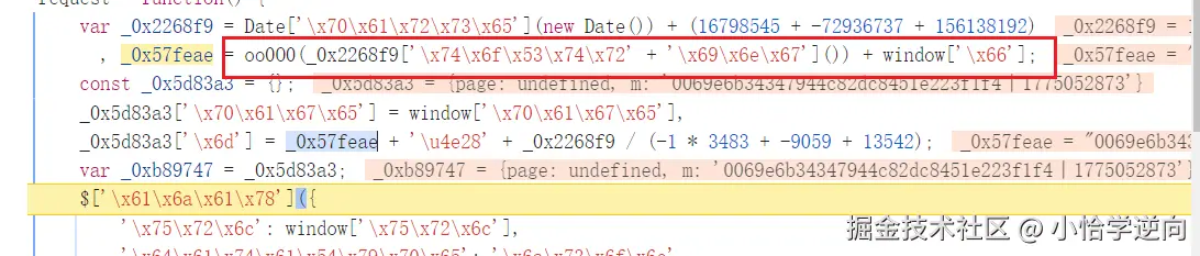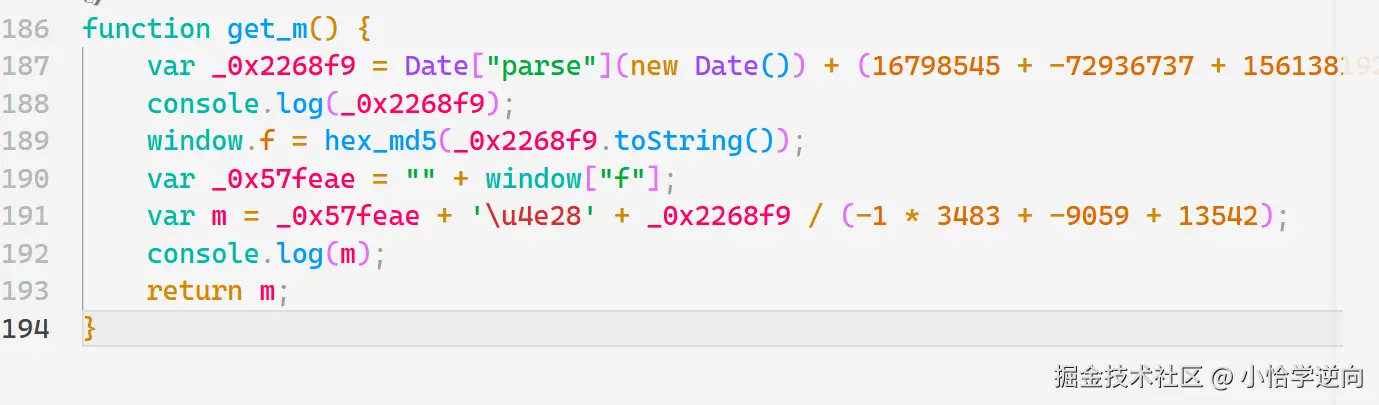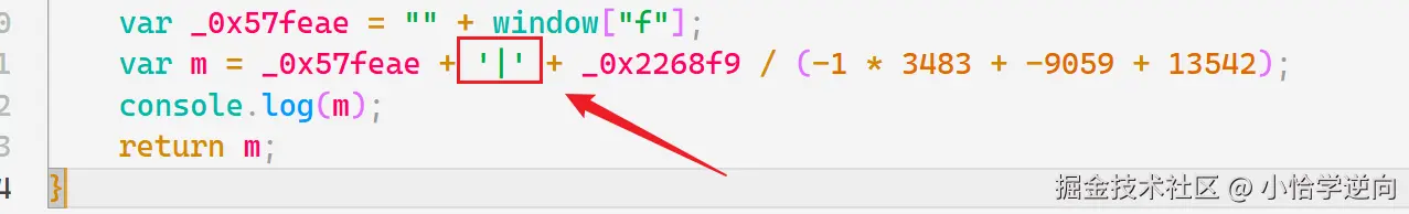 至于 m 是怎么生成的,有三个部分:_0x57feae 、| 、_0x2268f9 / (-1 * 3483 + -9059 + 13542)