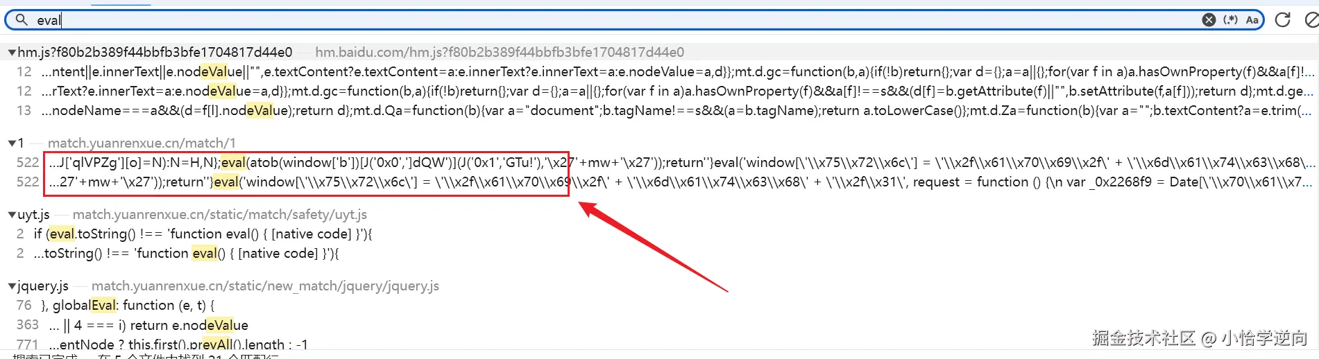既然也是个 全局对象 上的,也可以尝试搜一搜,我这里搜过了,找不到。搜了混淆的关键字 \x66 也无功而返。我陷入了思考:一个值不可能平白无故地出现,一种可能是它是服务器通过接口的返回值,所以在 JS 文件中找不到,另一种情况是它把赋值的代码 混淆 之后,通过 eval 函数执行。那么,搜一下 eval 关键字如何