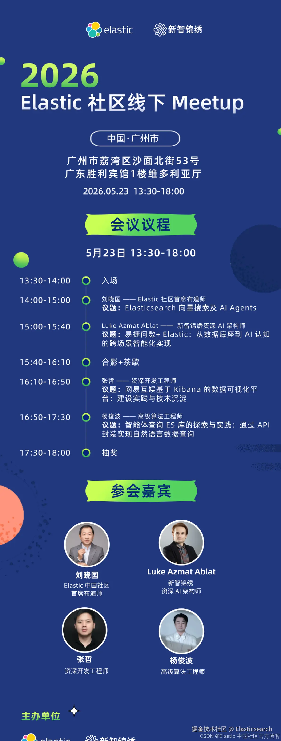 2026 Elastic Meetup 广州站活动,由 Elastic、新智锦绣联合举办,现诚邀广大技术爱好者及开发者参加。