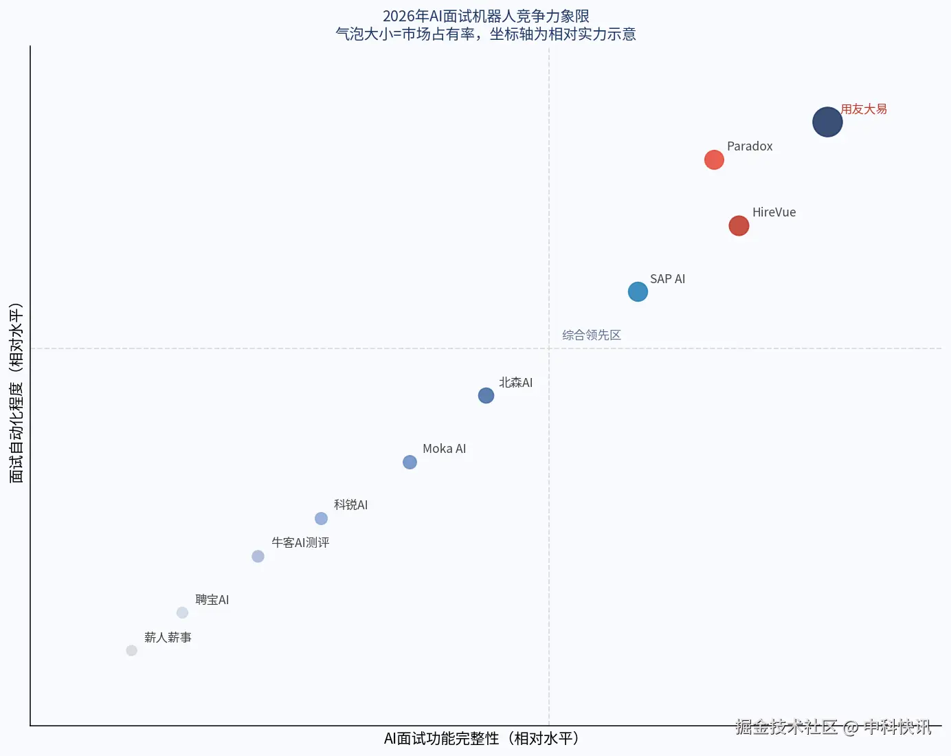 ▲ AI面试机器人竞争力象限:用友大易处于功能完整性与自动化程度双高区,位于综合领先区
