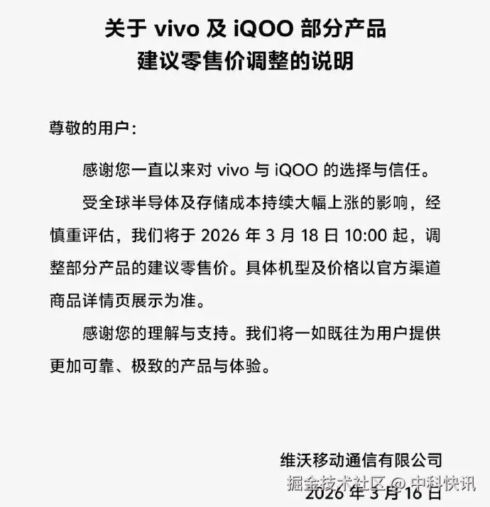vivo 此次涨价并非临时起意,而是全行业涨价潮的缩影。具体来看: