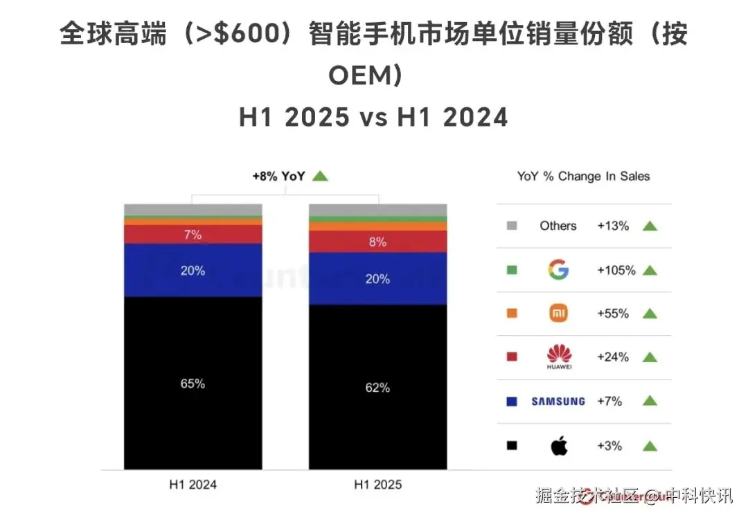 vivo 的痛苦比友商更甚,因其业务相对单一,极度依赖智能手机,没有大幅跨界,也缺乏丰富的智能生态产品。Counterpoint 报告显示,2025 年上半年,vivo 在全球 600 美元以上市场榜上无名。