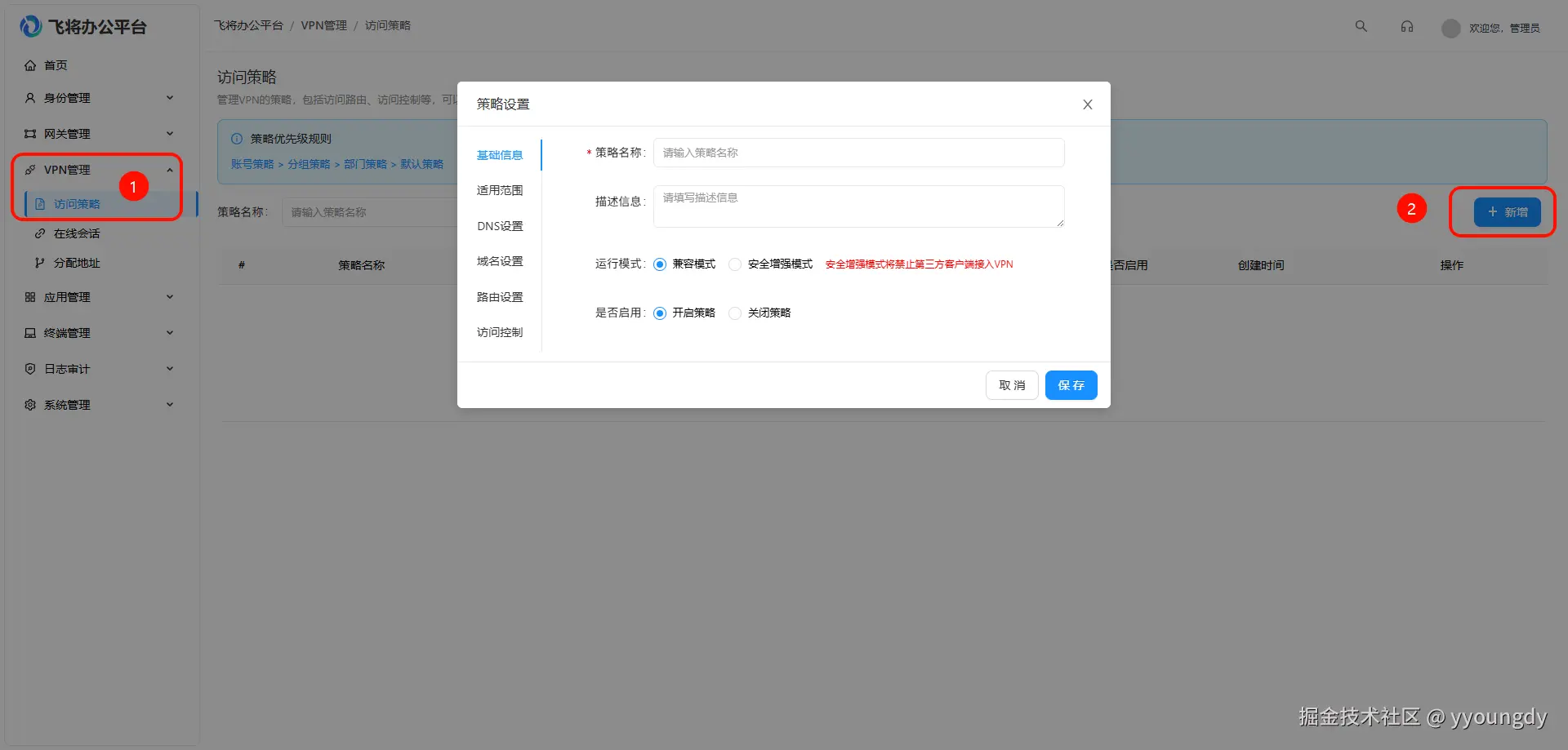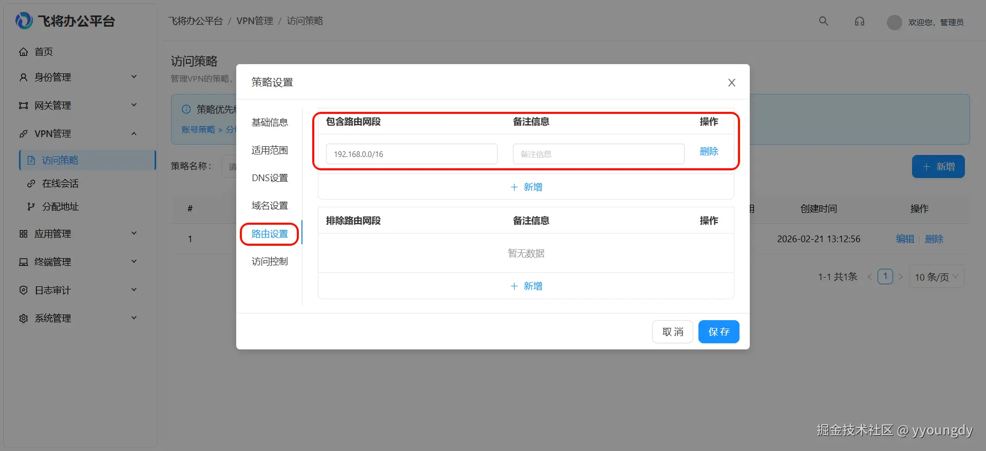 配置用户访问内网资源的权限策略,路由设置不要为空,留空会下发全局路由,可能会导致用户无法上网: