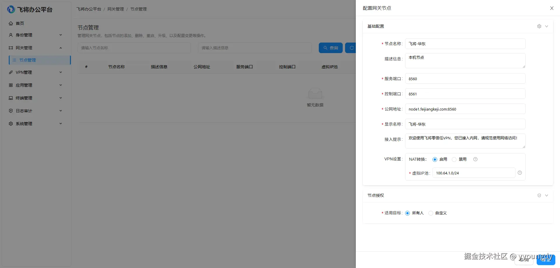 100.64.0.0/12这个范围,子网掩码可以选择24位或者23位,根据内网用户数决定,比如100.64.0.0/24或者100.64.0.0/23。 - NAT 转换:是否启用 SNAT。启用后,将虚拟 IP 地址 NAT 成